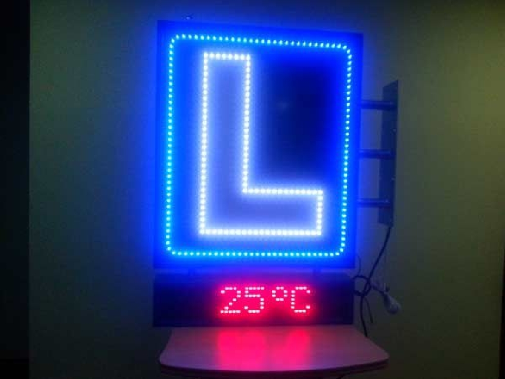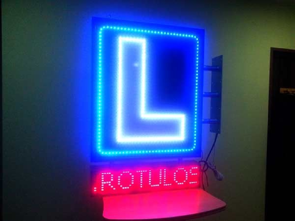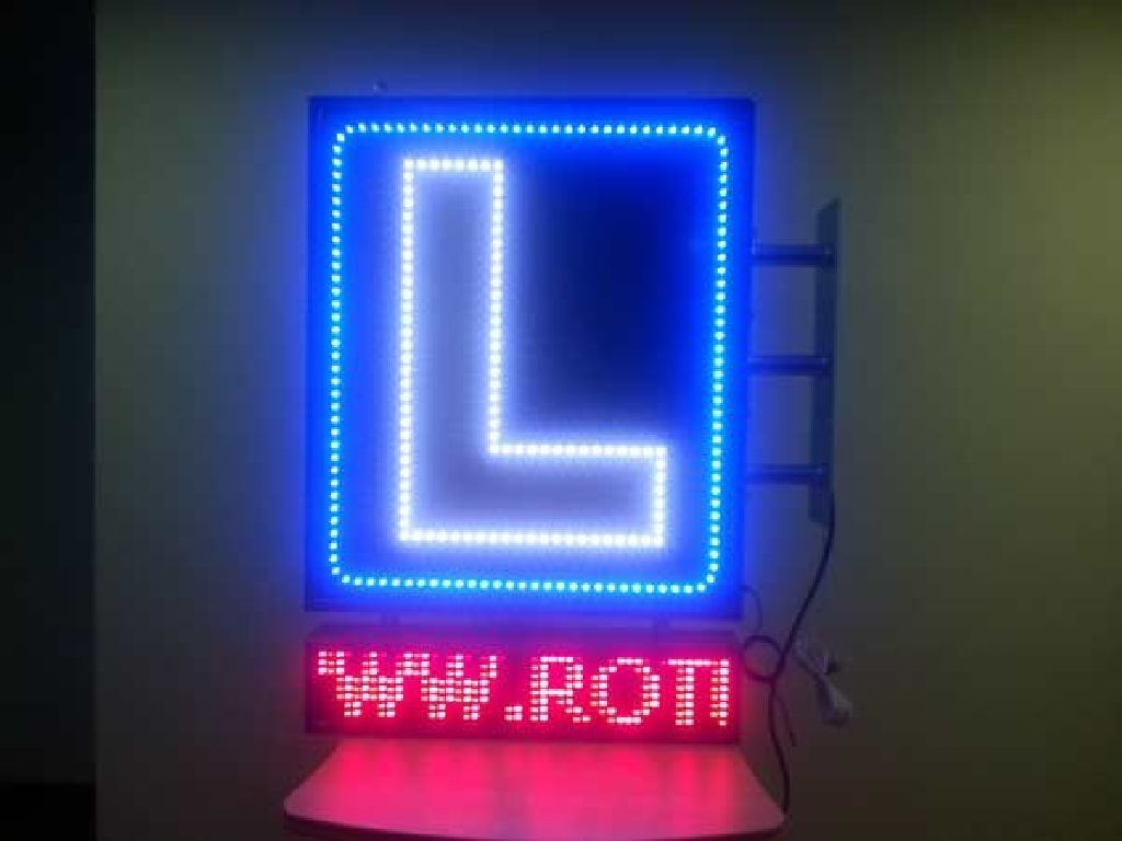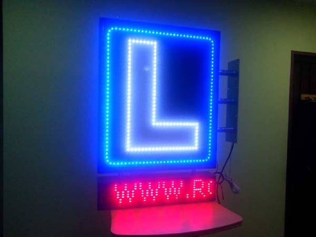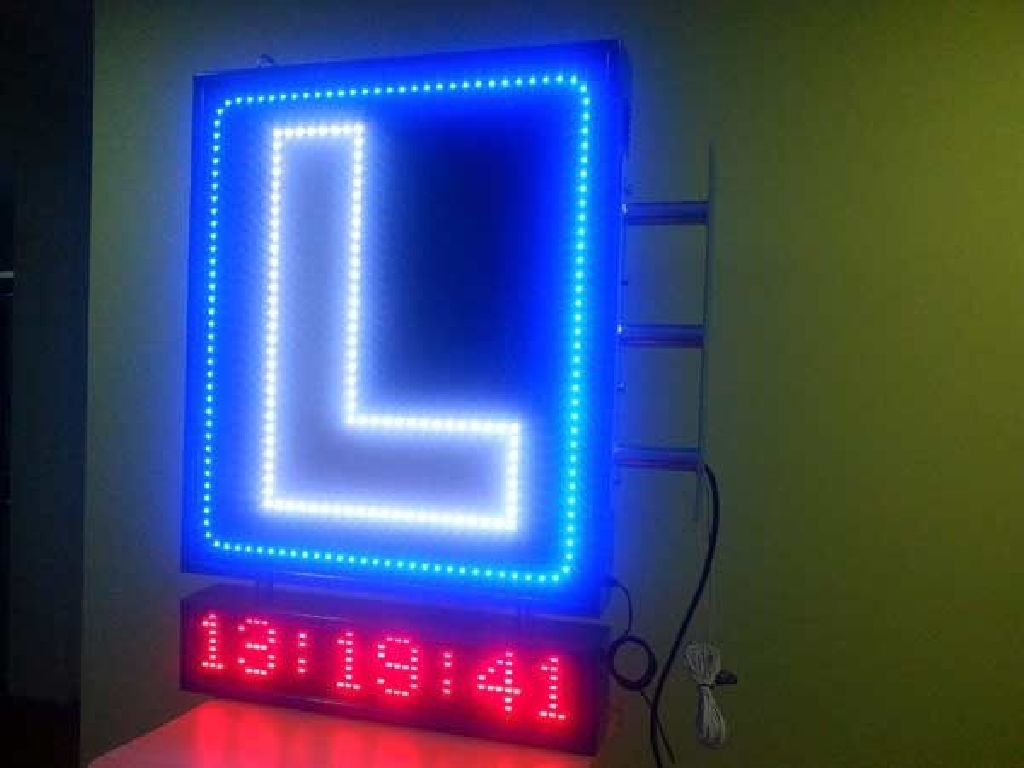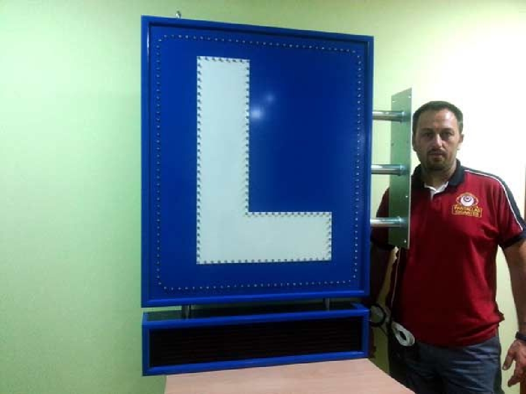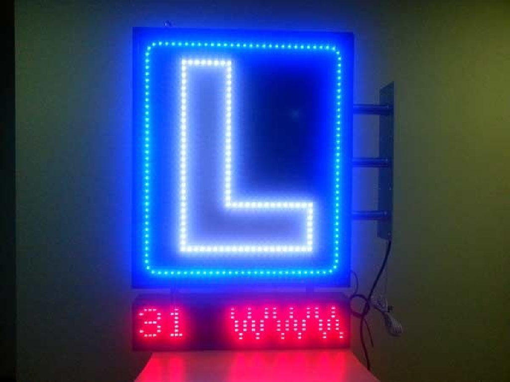 Cartel de autoescuela con leds de alta luminancia. Está compuesto de dos zonas. En la parte superior los LEDs azules crear un marco que rodea la letra L perfilada con LEDs blancos. En la zona inferior cuenta con una pantalla de texto móvil en la que podrá mostrar los textos que Ud. desee: promociones, ofertas, información de interés, etc. Dimensiones: 80 x 120 cms.