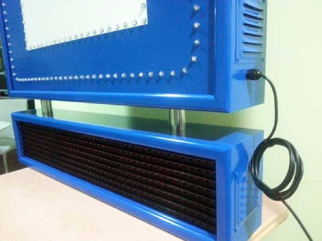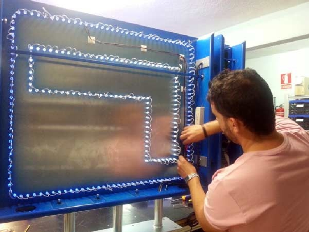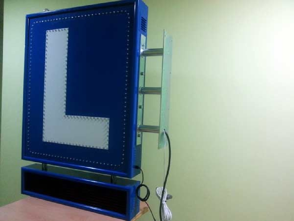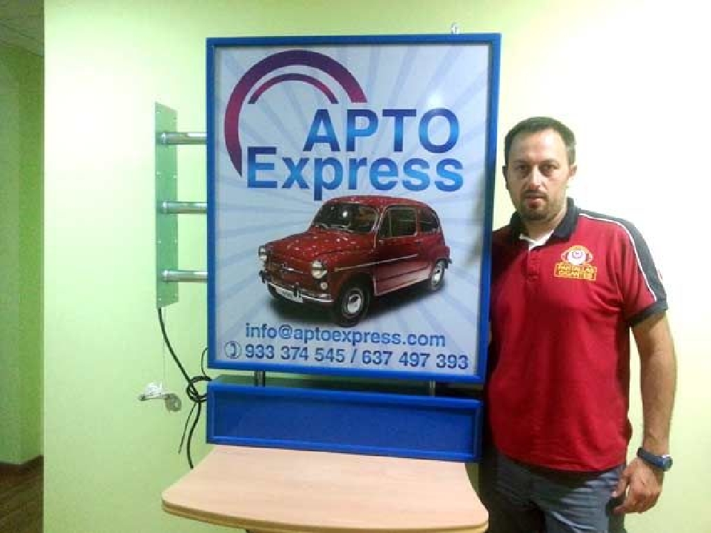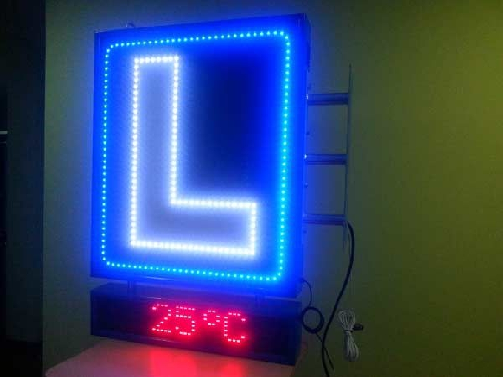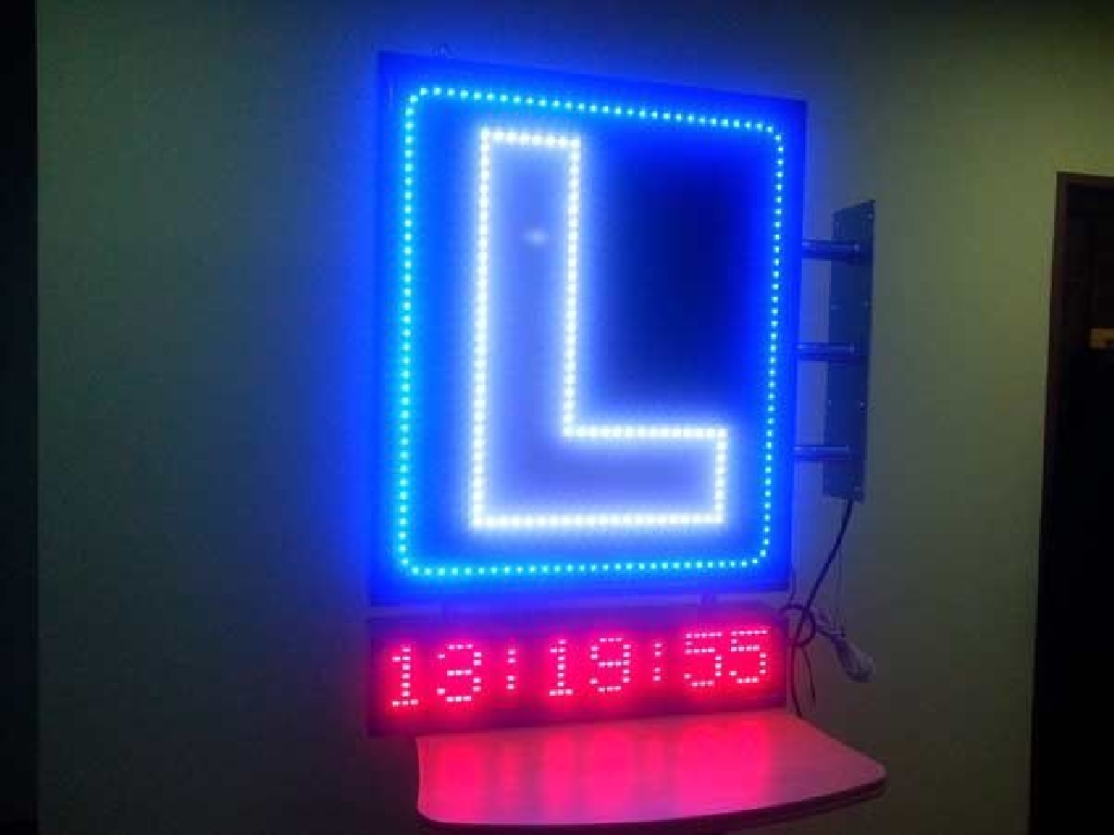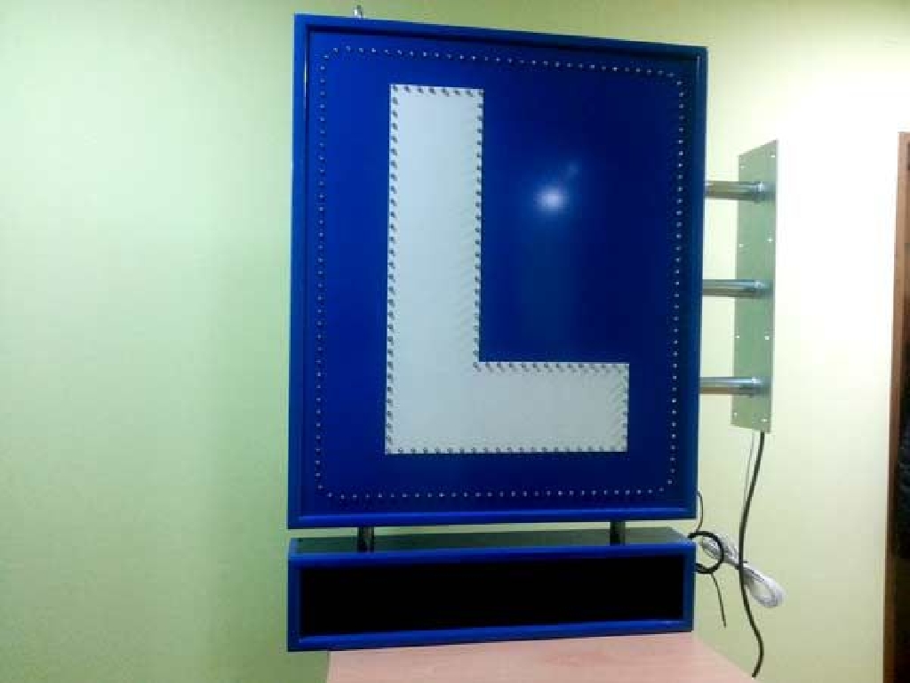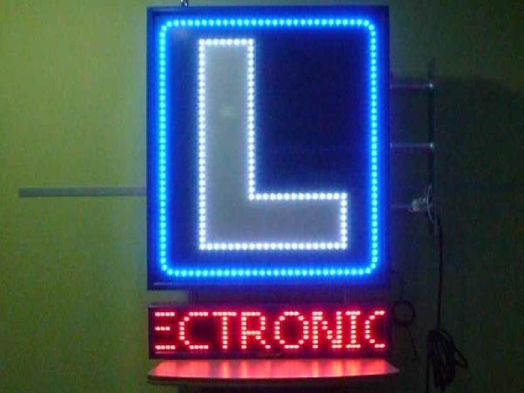 Cartel de autoescuela con leds de alta luminancia. Está compuesto de dos zonas. En la parte superior los LEDs azules crear un marco que rodea la letra L perfilada con LEDs blancos. En la zona inferior cuenta con una pantalla de texto móvil en la que podrá mostrar los textos que Ud. desee: promociones, ofertas, información de interés, etc. Dimensiones: 80 x 120 cms.