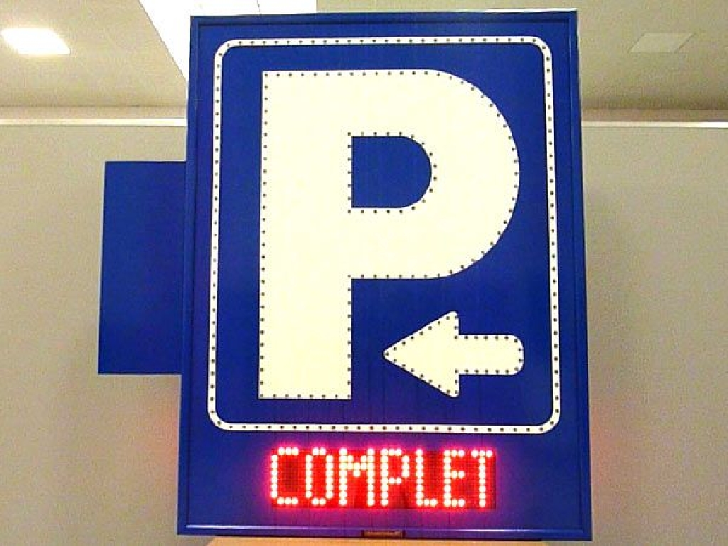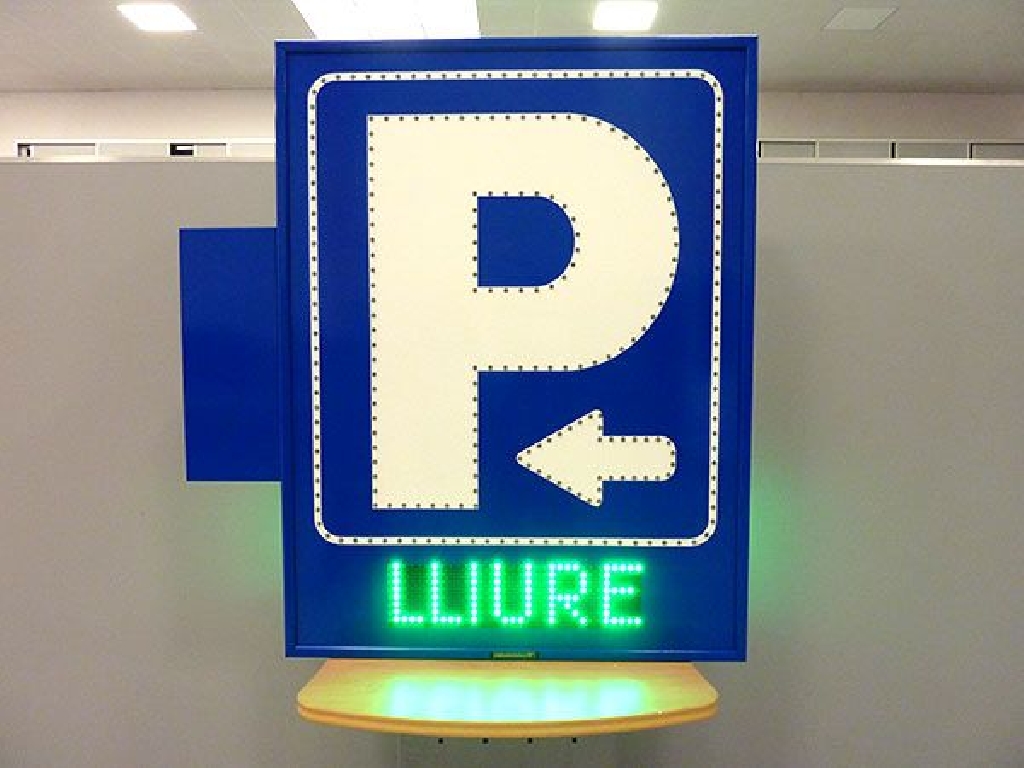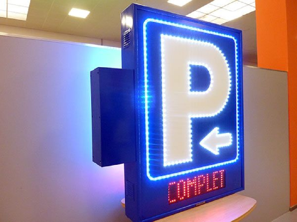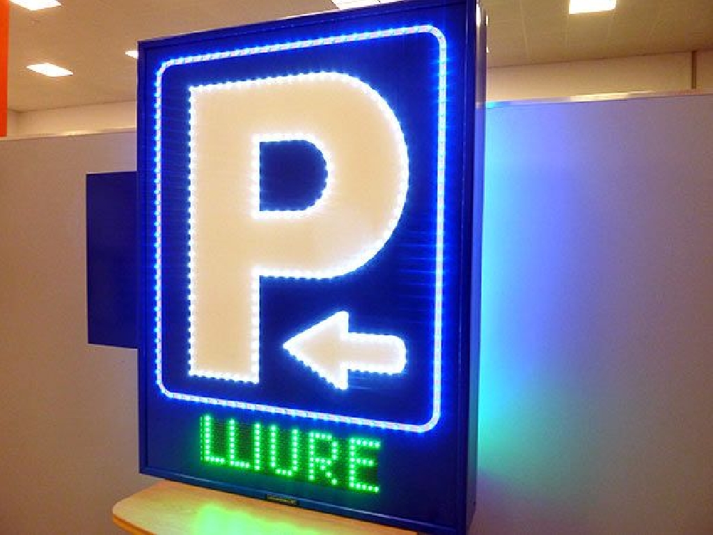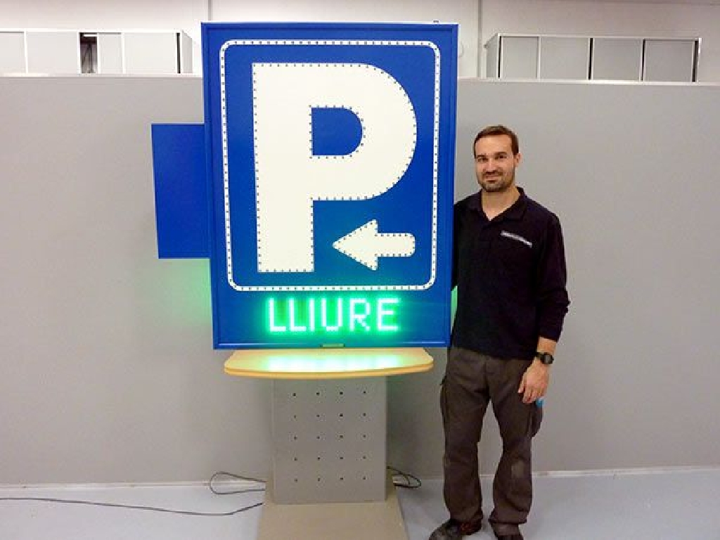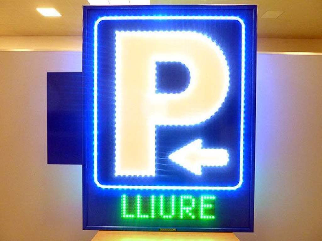Fabricaci贸n de carteles de parking para fachada con P, flecha y marco perfilados en LED. Display led con LIBRE / COMPLETO en catal谩n. Visibilidad por ambas caras. Dimensiones: 95×125 cm.