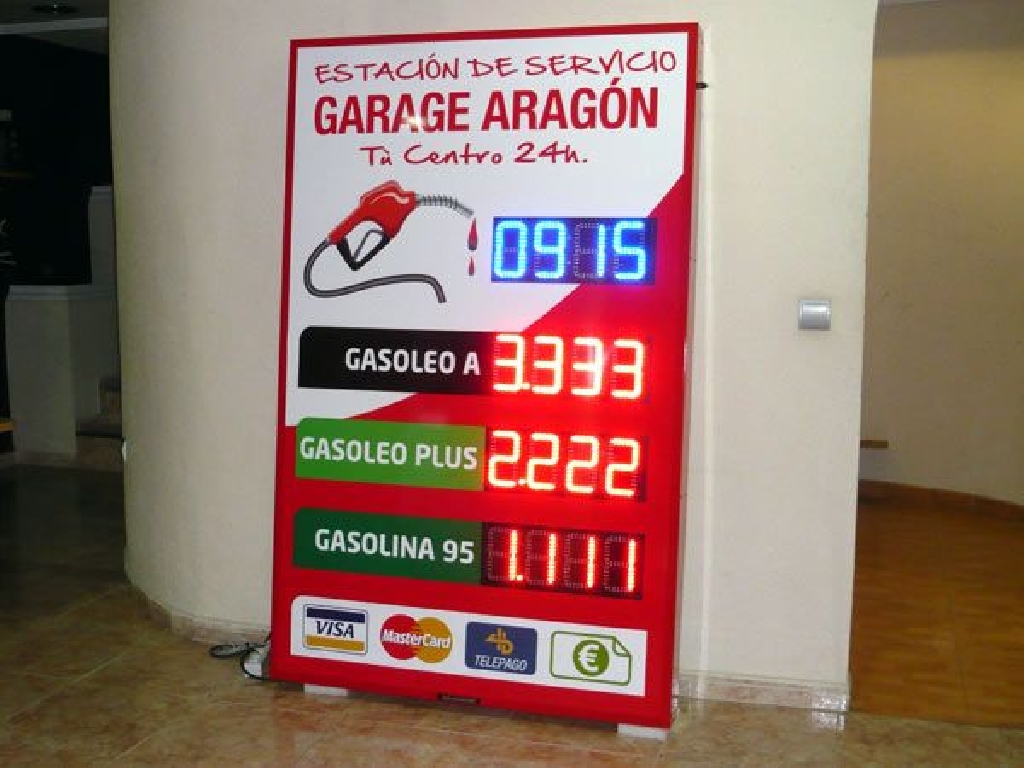 Carteles de precios para estaciones de servicio ubicadas en Zaragoza. Dimensiones: 120×190 cm. Altura de los d铆gitos: 15 cm. Color de led: rojo para los preciarios y azul para reloj-temperatura.