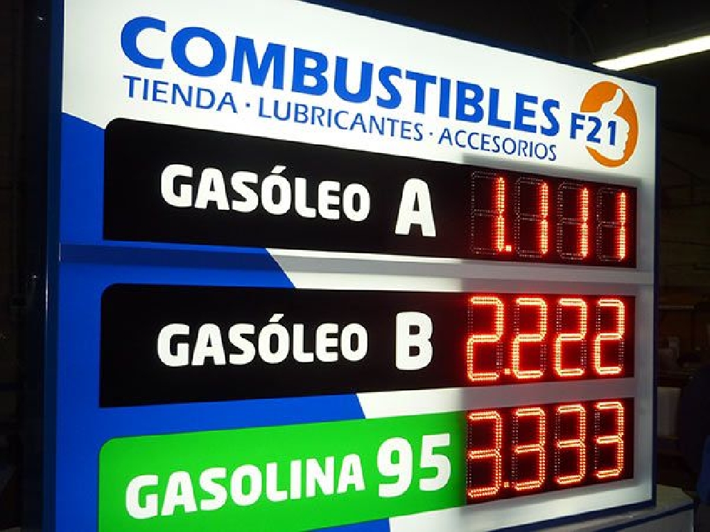 Fabricaci贸n de carteles led con precios para gasolinera para la estaci贸n de servicio Combustibles F21 ubicada en Murcia. Con unas dimensiones totales de 200×150 cm. se encuentra retroiluminado. Facilita los precios de tres combustibles en displays de d铆gitos led de alto brillo de color rojo y 25 cm. de altura. Cuenta con control mediante mando a distancia y con software para PC. Esto facilita una r谩pida actualizaci贸n de los precios que se muestran en el panel al instante de cambiarlos.