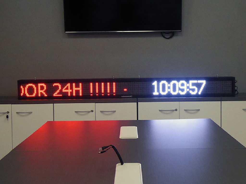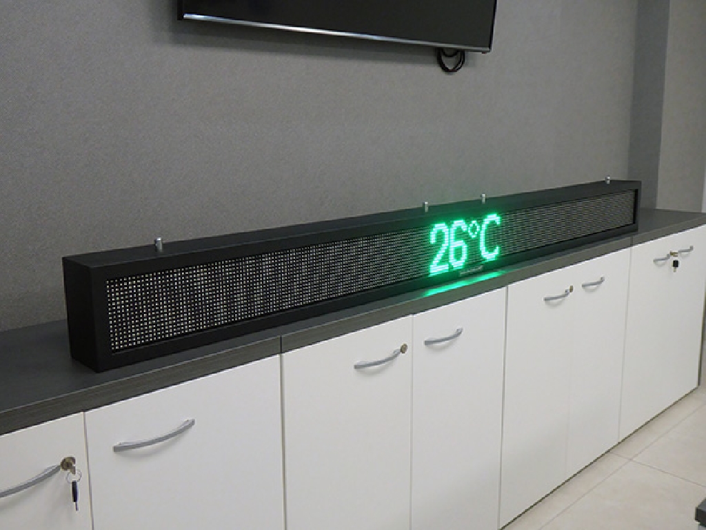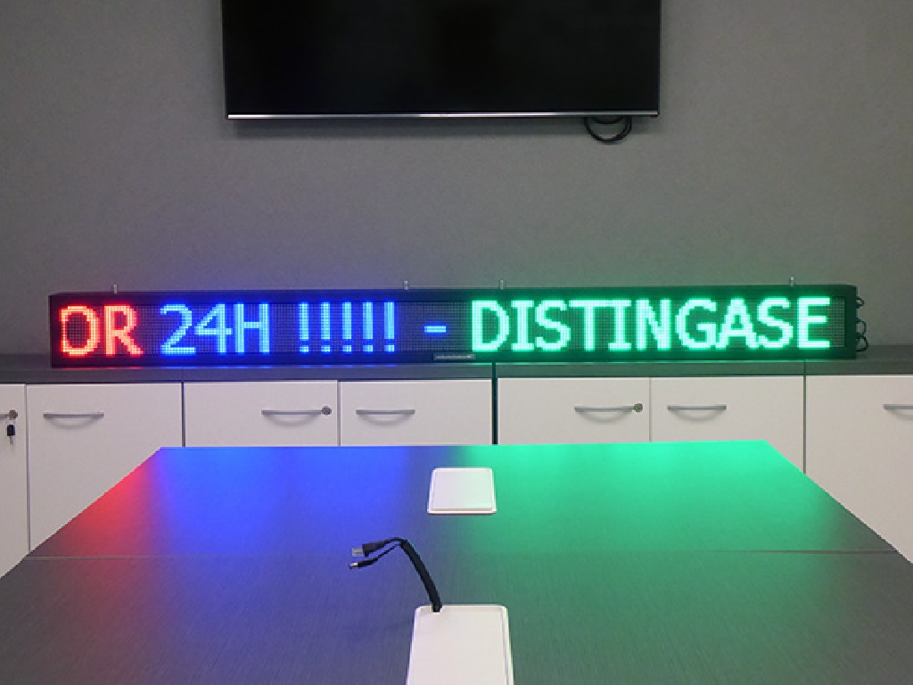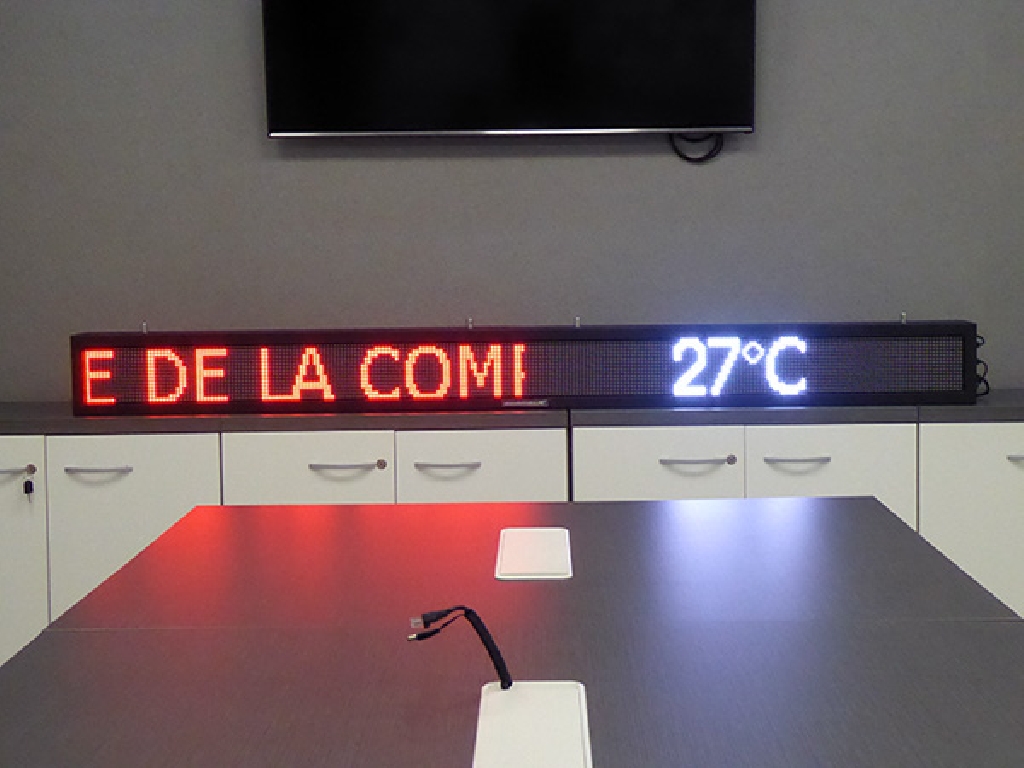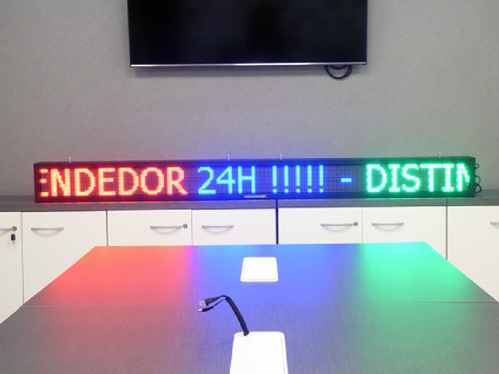 Letrero programable con capacidad de reproducir textos animados, imágenes y vídeos. Su resolución es de 256×16 px. Cuenta con Leds Full Color que permiten mostrar toda la gama de colores RGB.