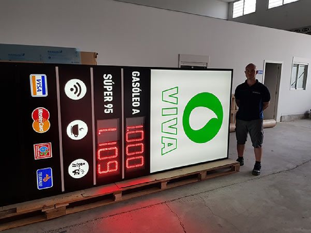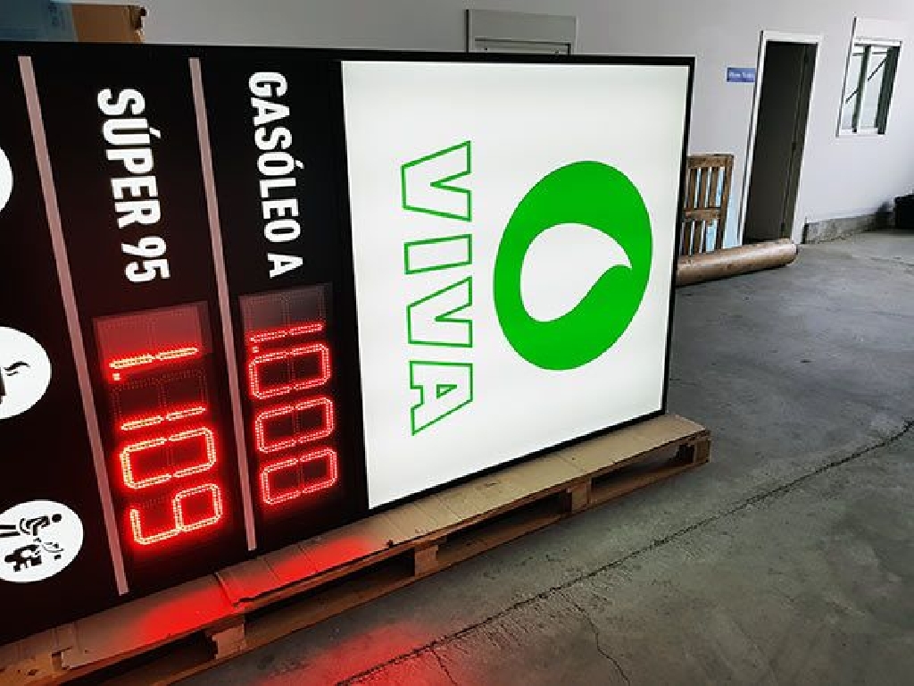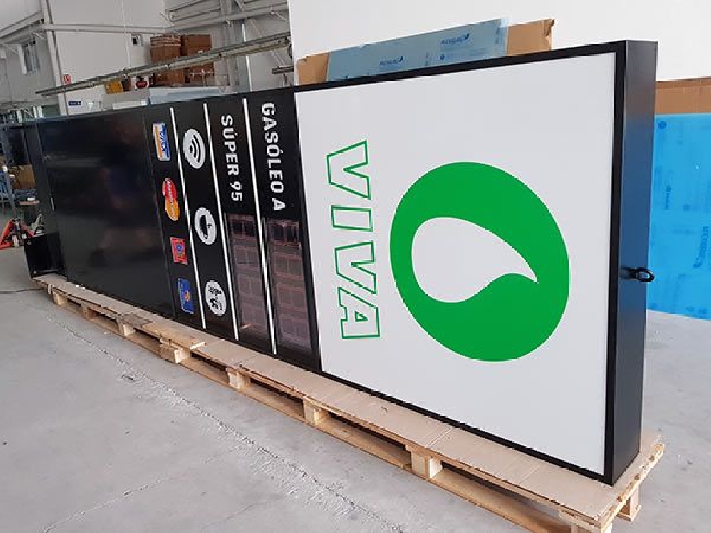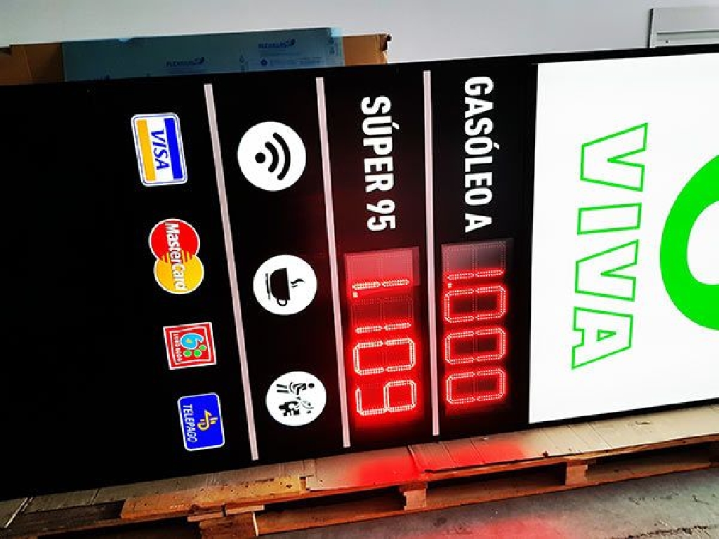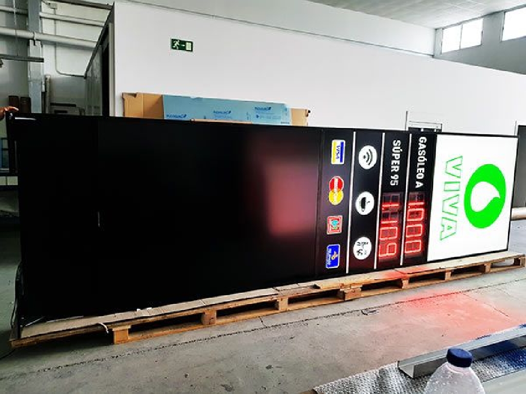 Monolitos para gasolineras con precios con unas dimensiones de 500 centímetros de altura por 150 centímetros de ancho. Con dos paneles LED de alto brillo para mostrar el precio de los combustibles
