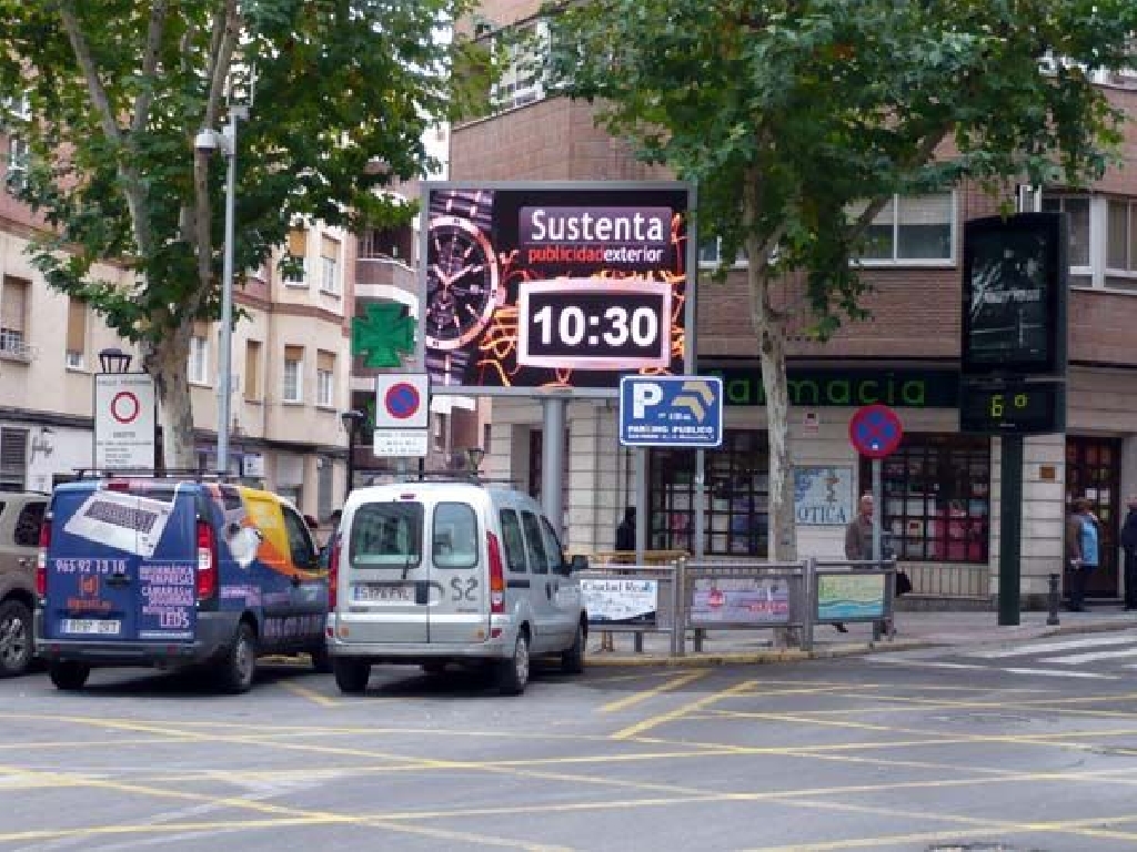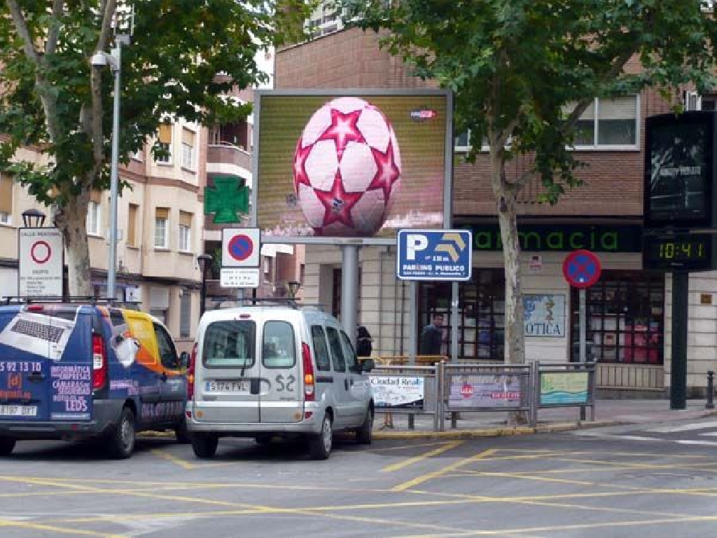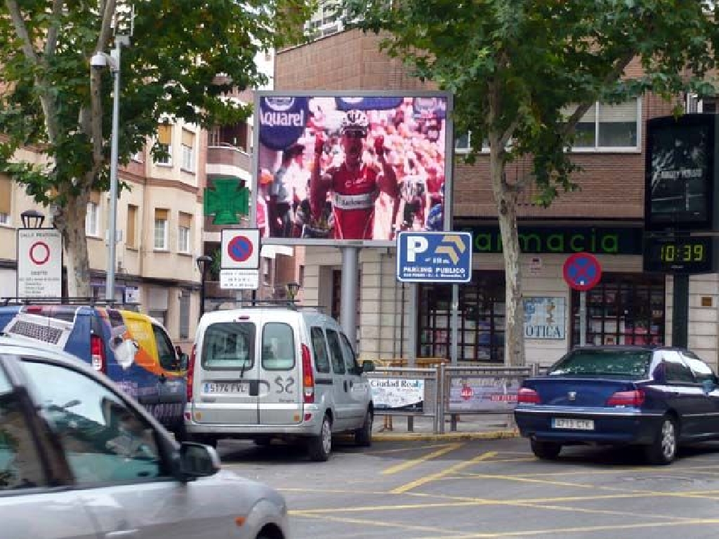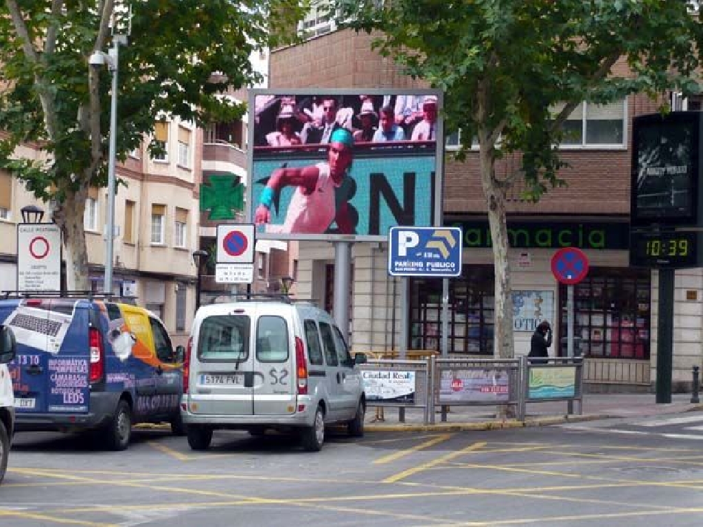 Este monoposte para publicidad se encuentra ubicado en una zona de gran tr谩nsito de Ciudad Real. Los spots emitidos provocan varias decenas de miles de impactos al mes, con el consiguiente beneficio para los anunciantes. Sus dimensiones son de 307×230 cms., con una superficie de 7.1 m2. La pantalla fullcolor de leds P8V/16R tiene una resoluci贸n de 384×288 px.