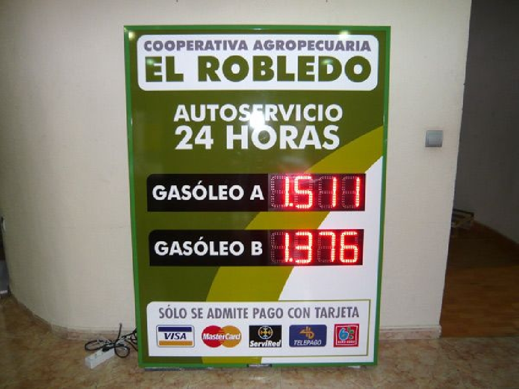 Paneles de precio para estaciones de servicio de 120×165 cm. fabricado para la Cooperativa El Robledo. Modelo para colgar en pared con 2 displays led rojos con d铆gitos de 15 cm. de altura.