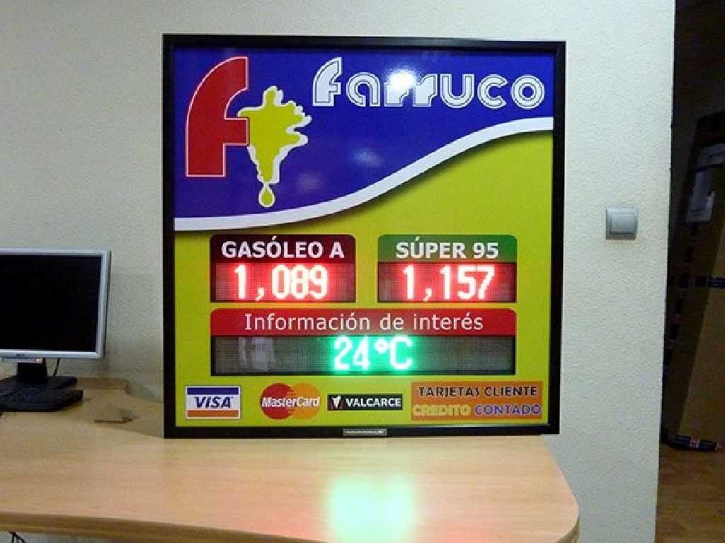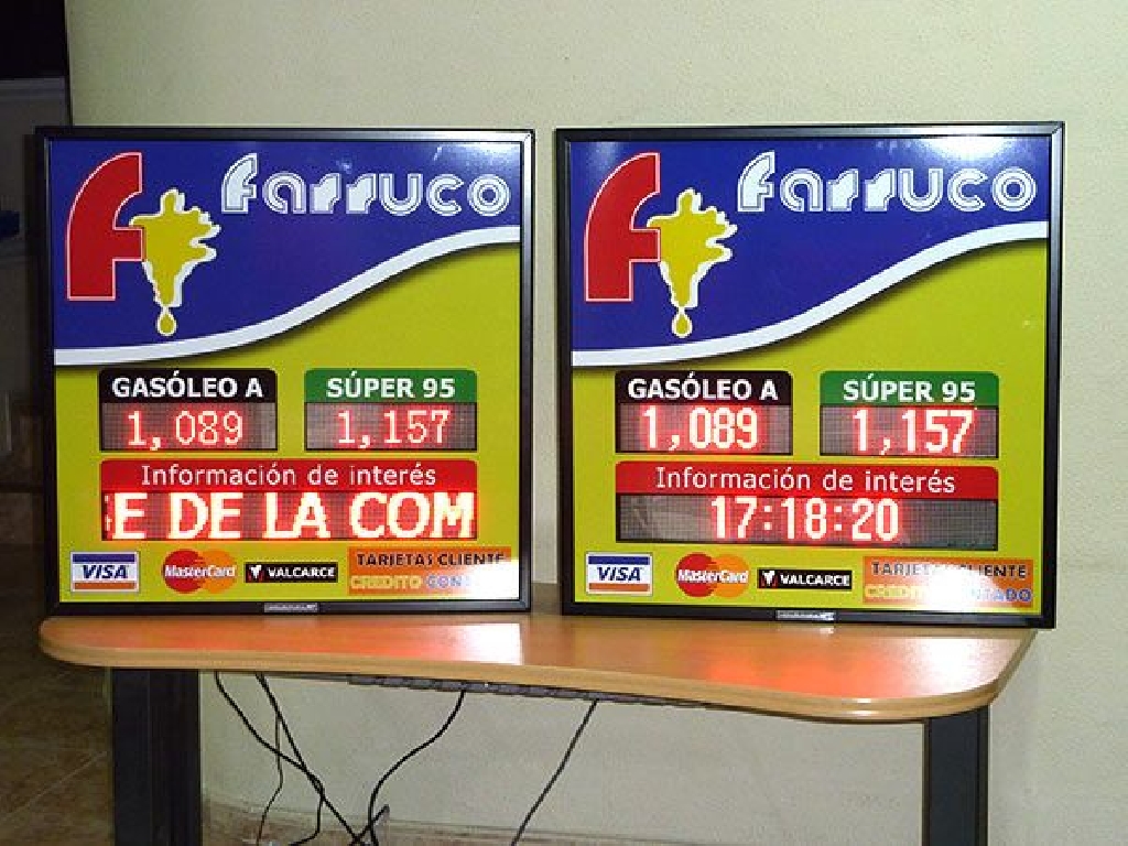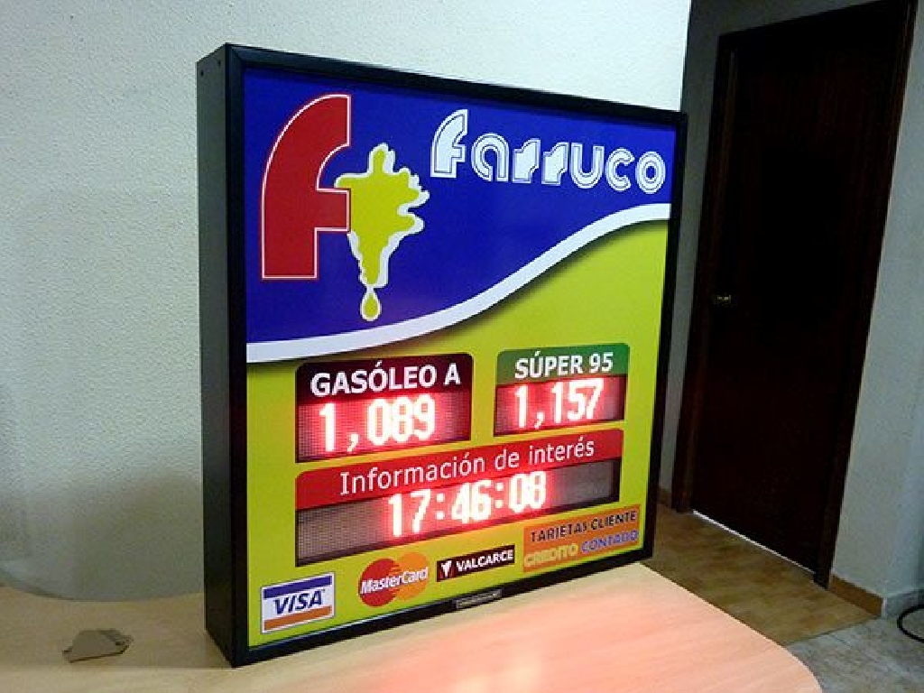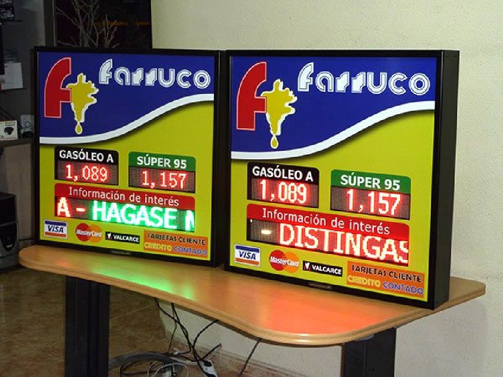 Paneles informativos para gasolineras fabricados para el grupo Farruco. Estos letreros tienen unas dimensiones de 80×80 cm. Cuentan con 2 displays de dígitos led para mostrar el precio del Gasóleo A y de la gasolina Súper 95. Incorporan una pantalla informativa de textos en la zona inferior. Muestra caracteres alfanuméricos de 8 cm. de alto en color verde y rojo.