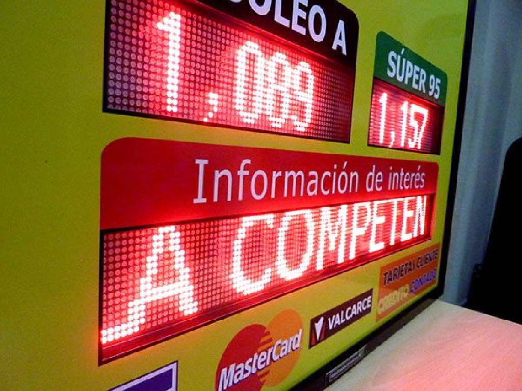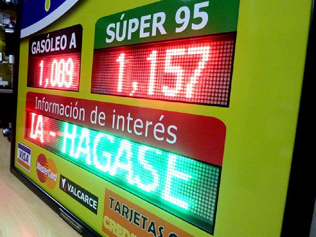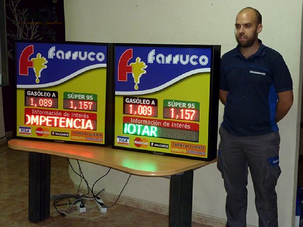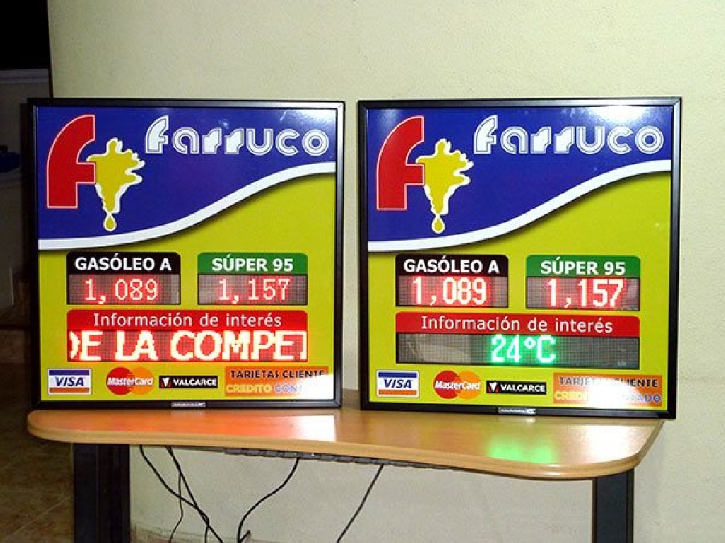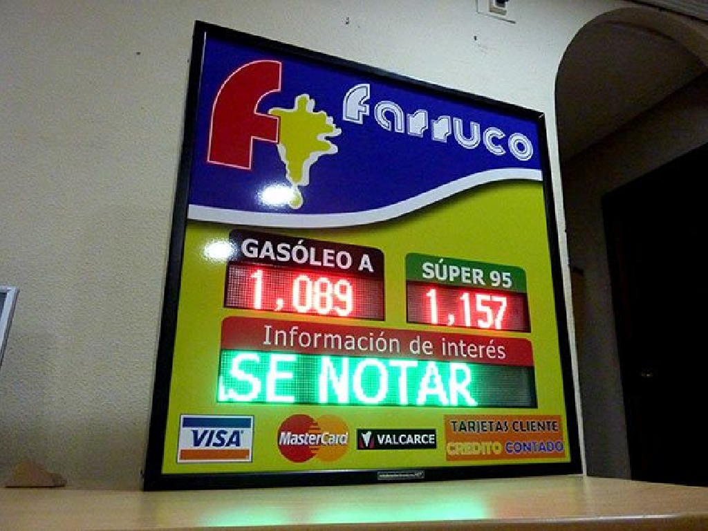 Paneles informativos para gasolineras fabricados para el grupo Farruco. Estos letreros tienen unas dimensiones de 80×80 cm. Cuentan con 2 displays de dígitos led para mostrar el precio del Gasóleo A y de la gasolina Súper 95. Incorporan una pantalla informativa de textos en la zona inferior. Muestra caracteres alfanuméricos de 8 cm. de alto en color verde y rojo.