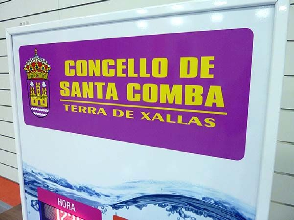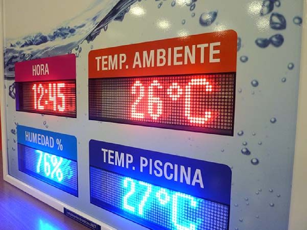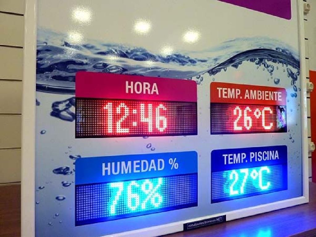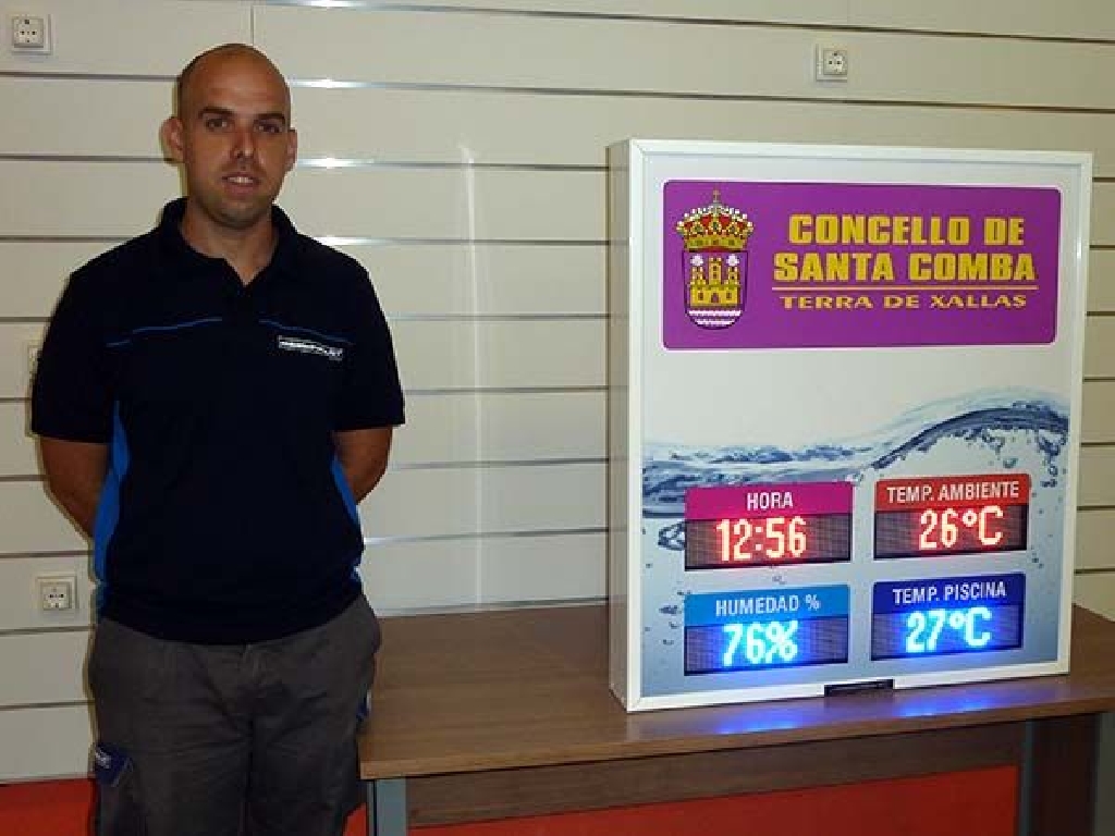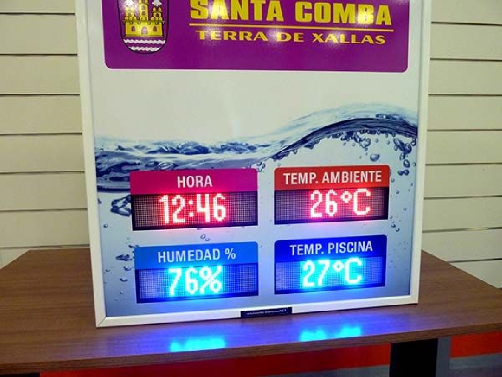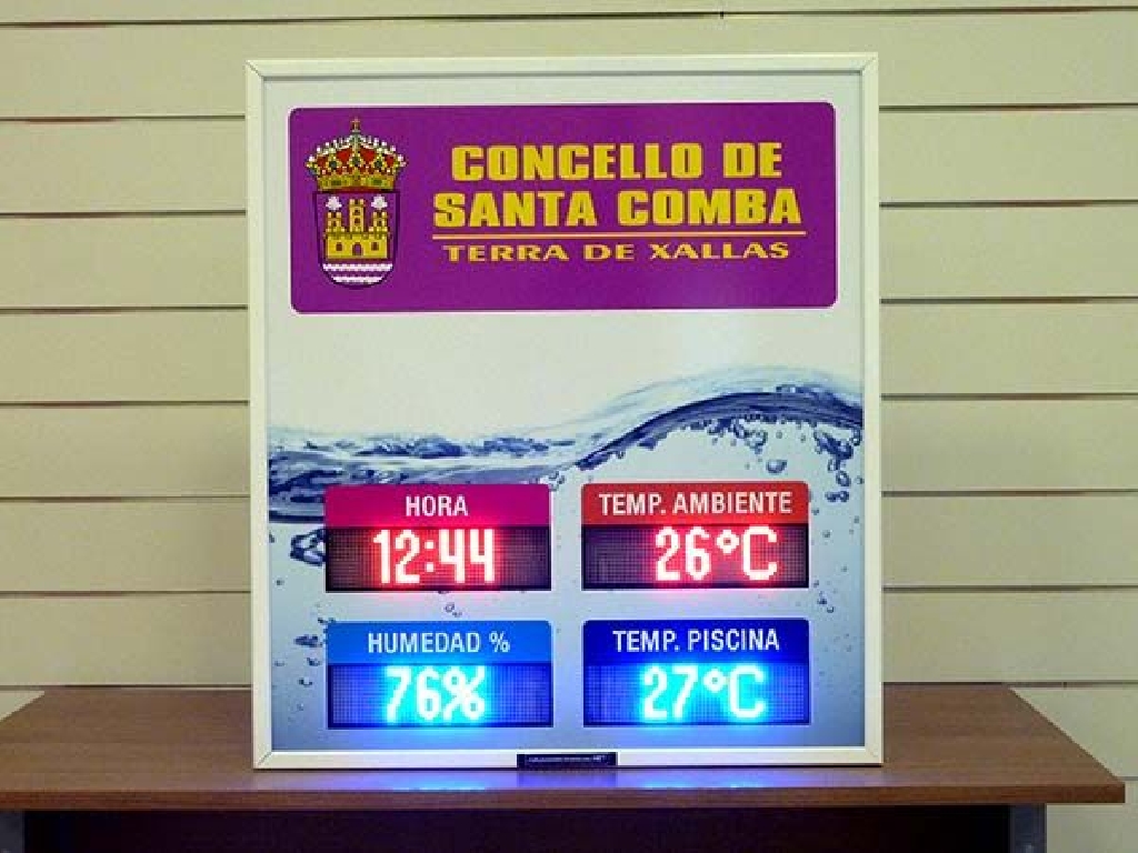 Fabricaci贸n de pantallas de temperatura para piscinas climatizadas del Concello e Santa Comba. Dimensiones: 80×90 cm. Altura de d铆gito: 8 cm. Muestra hora, temperatura ambiente, humedad relativa y temperatura del agua de un vaso.
