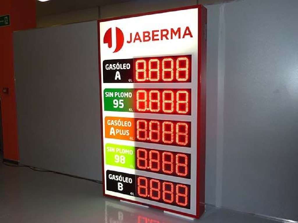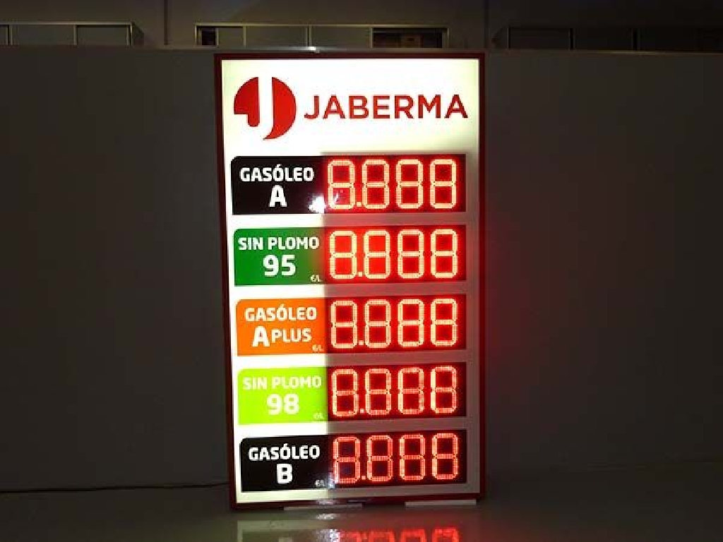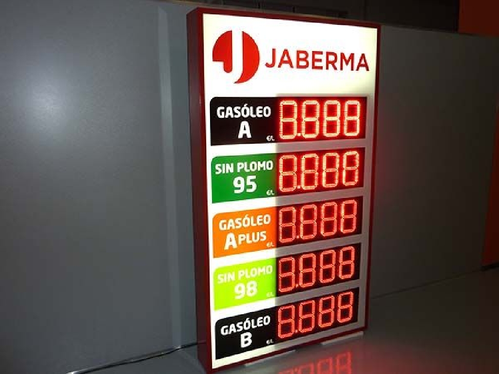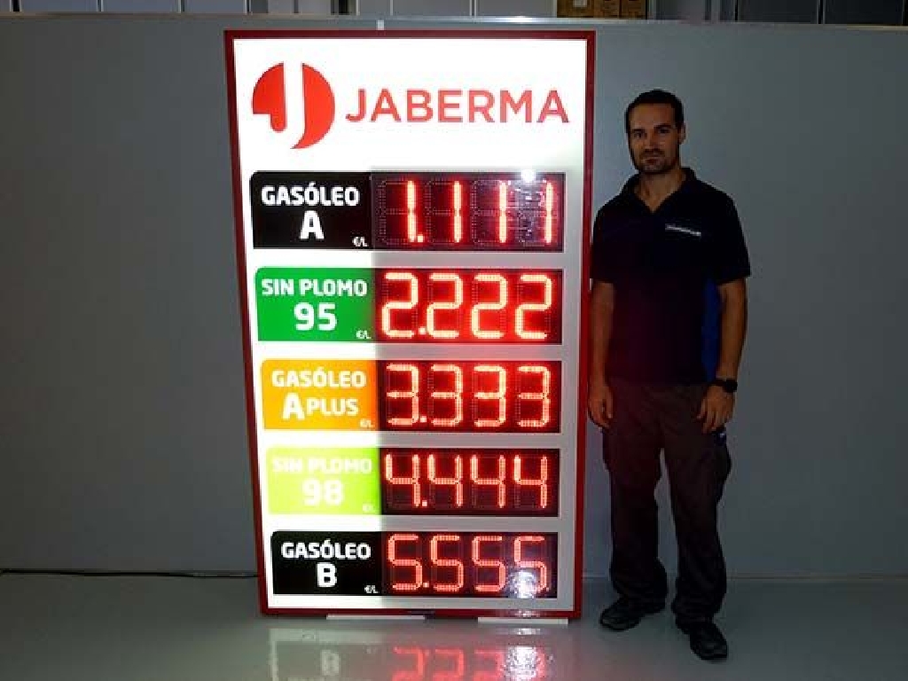 Fabricación de preciarios con digitos led para instalación en fachadas de gasolineras y estaciones de servicio. Este modelo tiene unas dimensiones de 110×190 cm. y cuenta con 5 displays LED de dígitos luminosos de 20 cm. de altura. Facilita precio de Gasóleo A, Sin Plomo 95 y 98, Gasóleo A Plus y Gasóleo B. Fabricado para Gasolinera Jaberma.