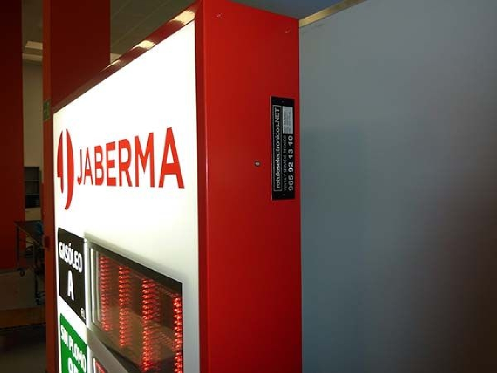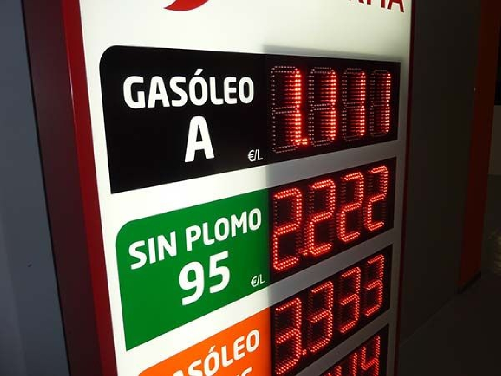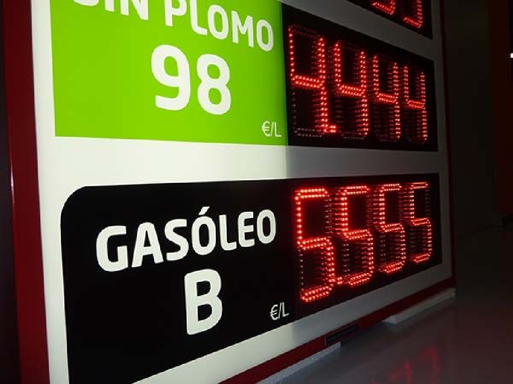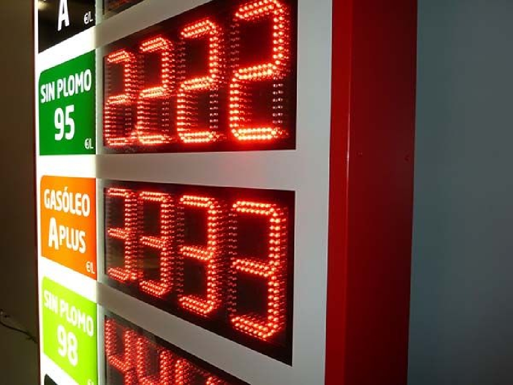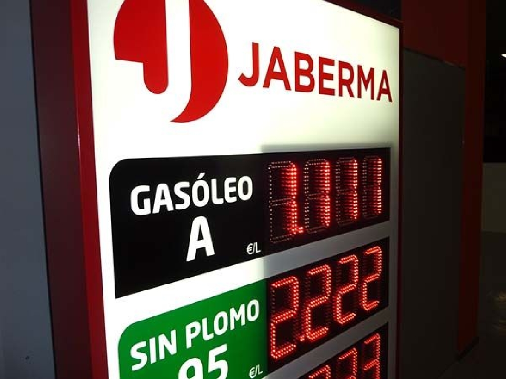 Fabricación de preciarios con digitos led para instalación en fachadas de gasolineras y estaciones de servicio. Este modelo tiene unas dimensiones de 110×190 cm. y cuenta con 5 displays LED de dígitos luminosos de 20 cm. de altura. Facilita precio de Gasóleo A, Sin Plomo 95 y 98, Gasóleo A Plus y Gasóleo B. Fabricado para Gasolinera Jaberma.