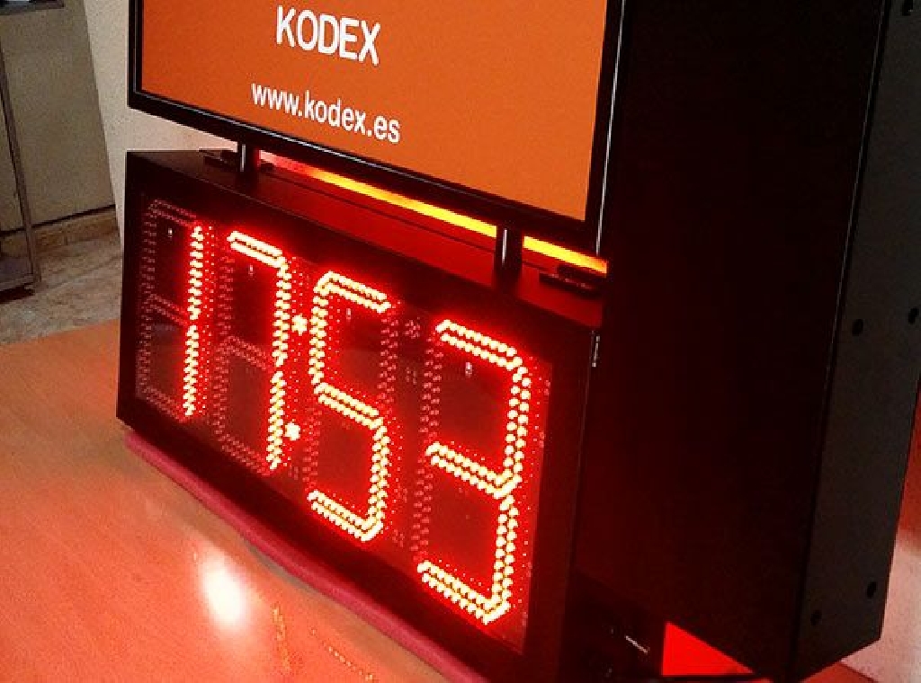 Reloj banderola de doble cara fabricado para la empresa Kodex. Preparado con una garra de sujeci贸n para instalaci贸n en fachada es visible por ambas caras. Incluye un reloj-temperatura con d铆gitos LED de color rojo. La altura de sus d铆gitos es de 25 cm. Dimensiones totales (sin contar la garra): 78×78 cm.