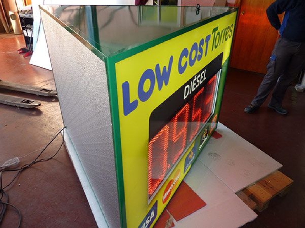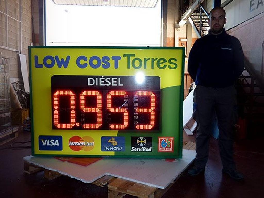Fabricación a medida de rótulo luminoso cuña para gasolinera para las Estaciones de Servicio Low Cost Torres. Panel con forma de prisma para instalación en fachada con displays de precios COMBUS40 rojo de alto brillo para mostrar el precio del diésel.