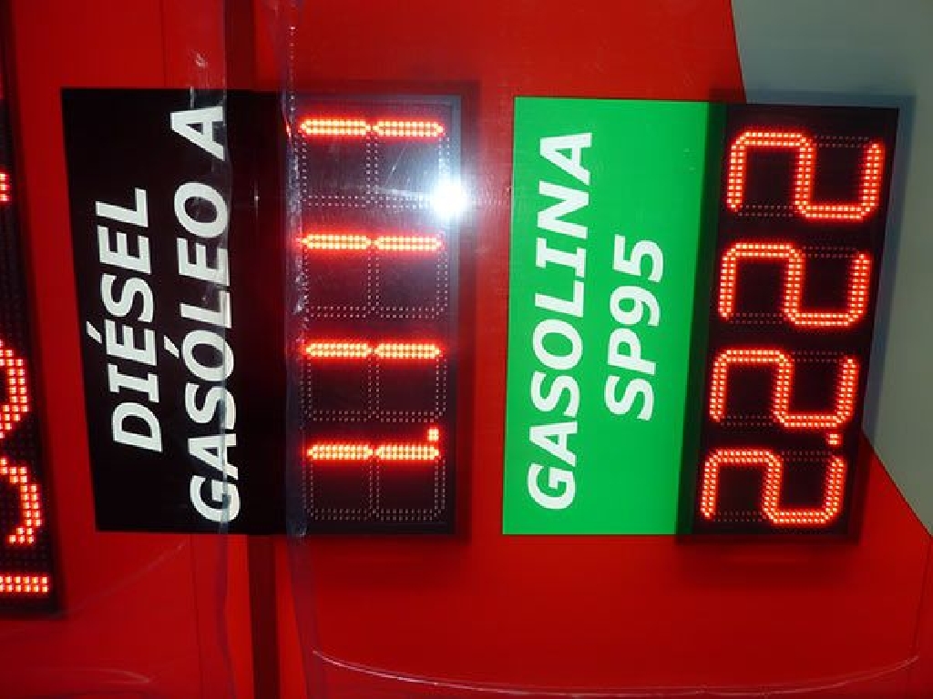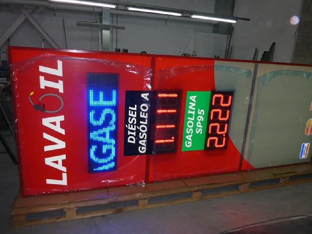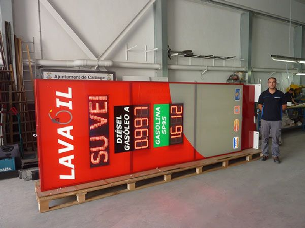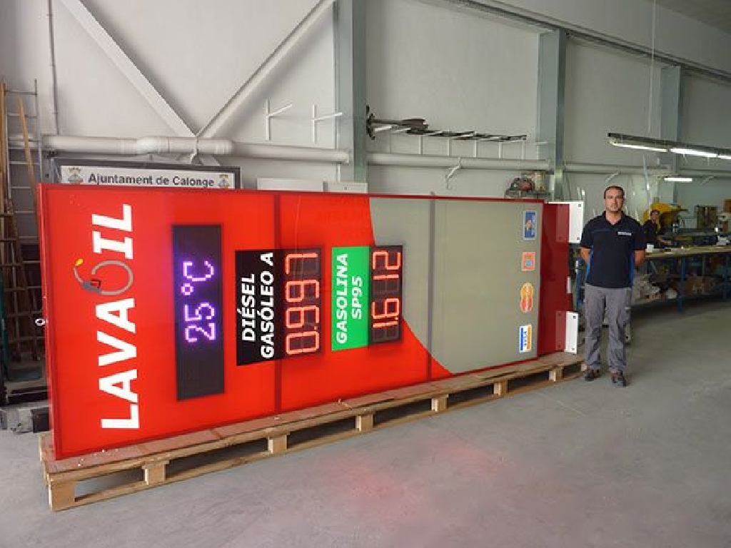 tótems luminosos para gasolineras con unas dimensiones de 150×450 centímetros y displays para precios LED COMBUS25 de color rojo. Incluye pantalla para texto de 100×25 centímetros que muestra textos, hora y temperatura. También incluye software en castellano