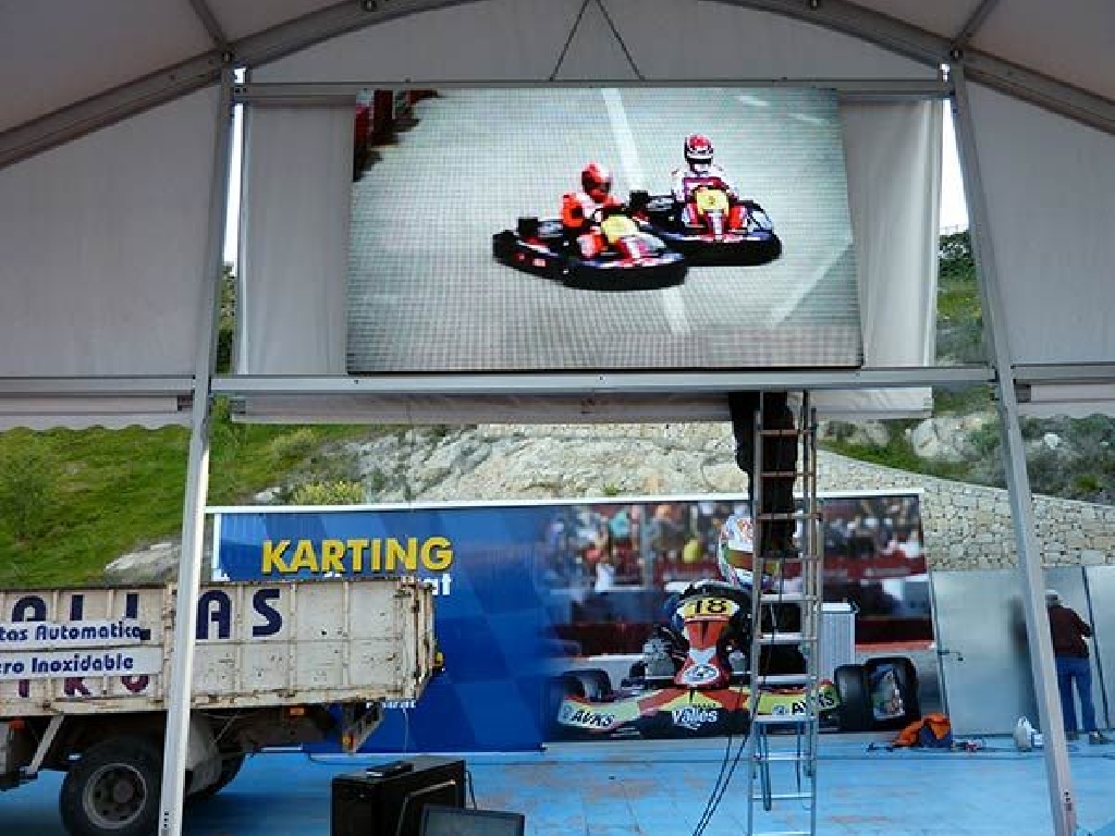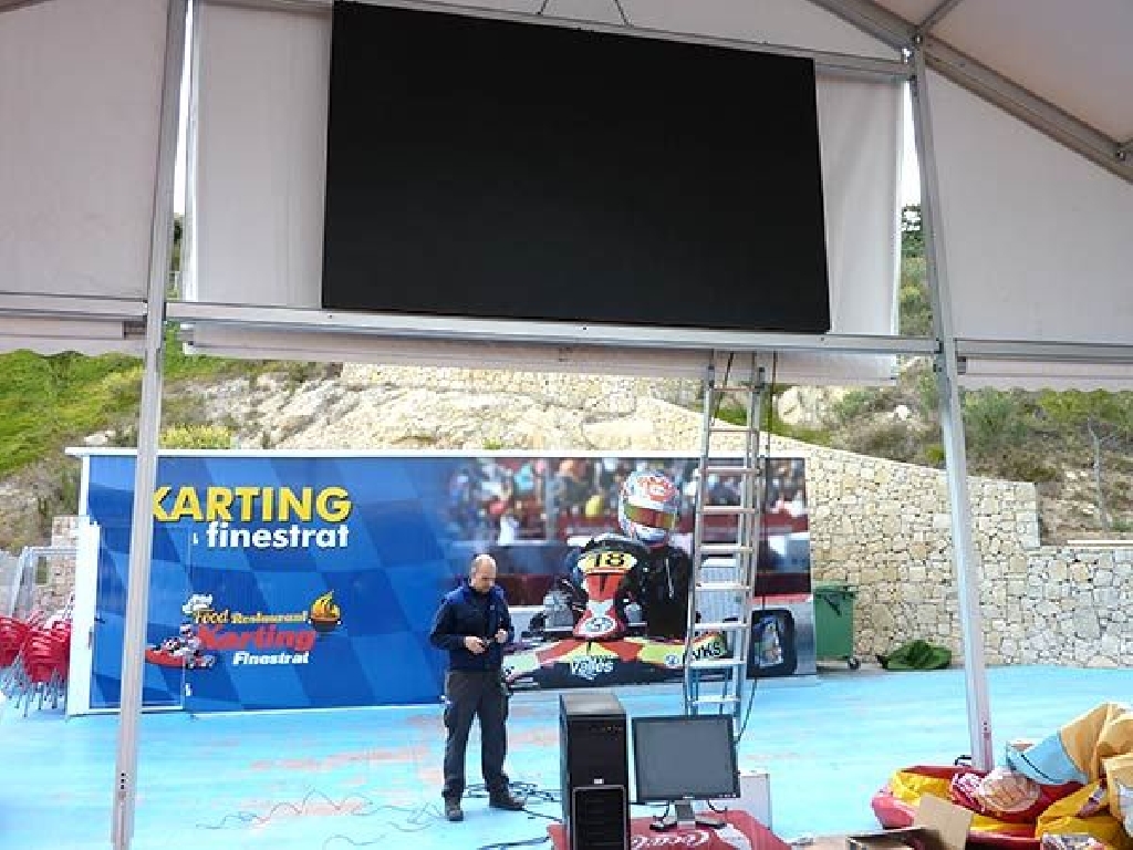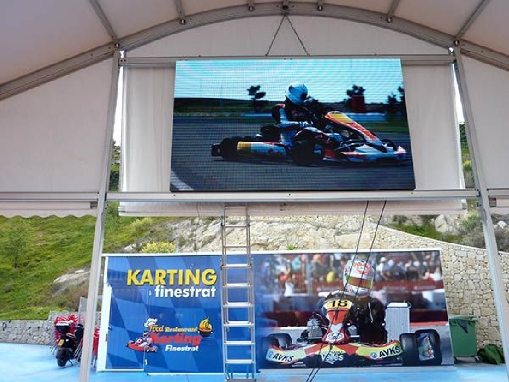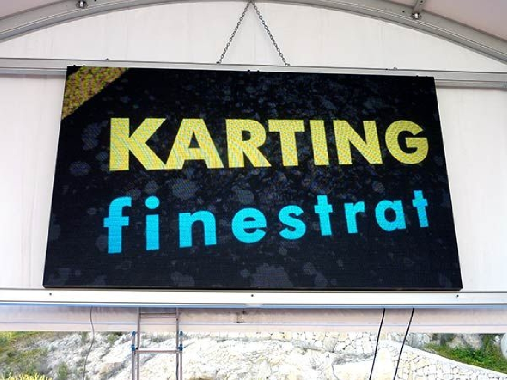 Suministro e instalaci贸n de videomarcadores para karting en el circuito de Karting Finestrat, situado cerca de Benidorm. La pantalla tiene unas dimensiones de 320×192 cm. Gracias a un paso P5 mm. (distancia entre puntos) goza de una gran definici贸n, alcanzando una resoluci贸n de 640×384 px. Son perfectos no s贸lo como marcadores de tiempos sino como pantallas gigantes para emitir carreras de MotoGP, F贸rmula 1, encuentros de f煤tbol, partidos de tenis, baloncesto, conciertos musicales, etc.