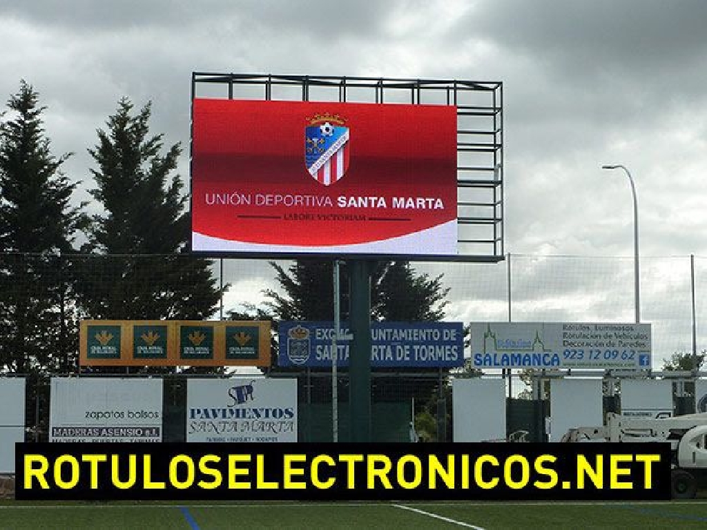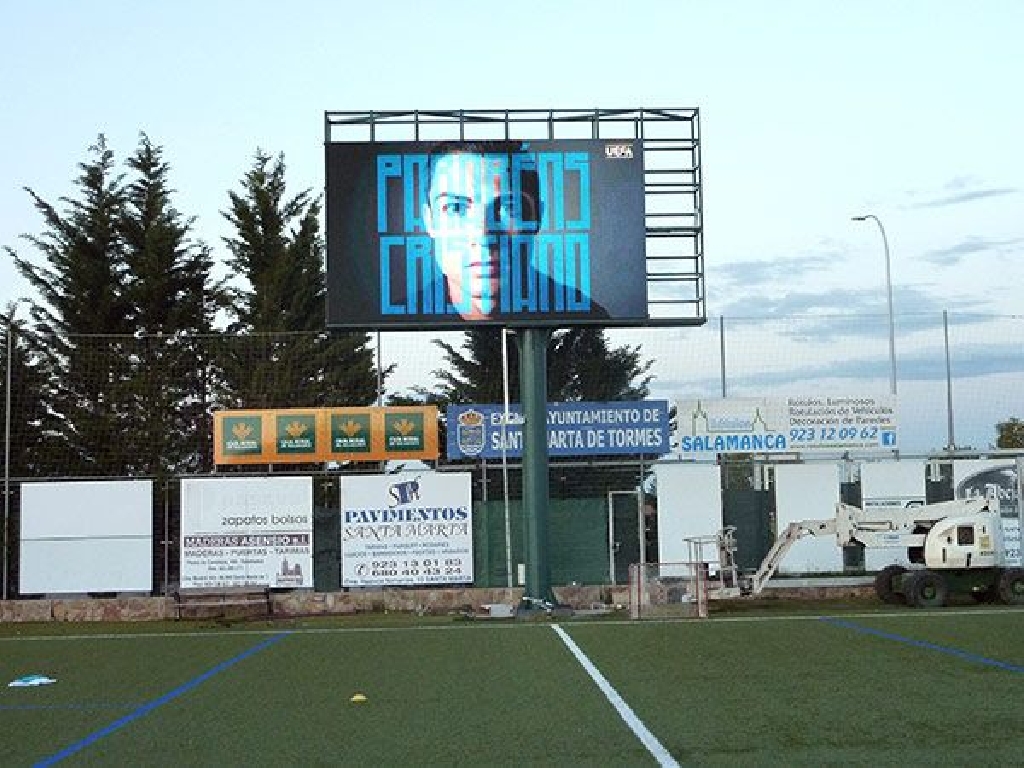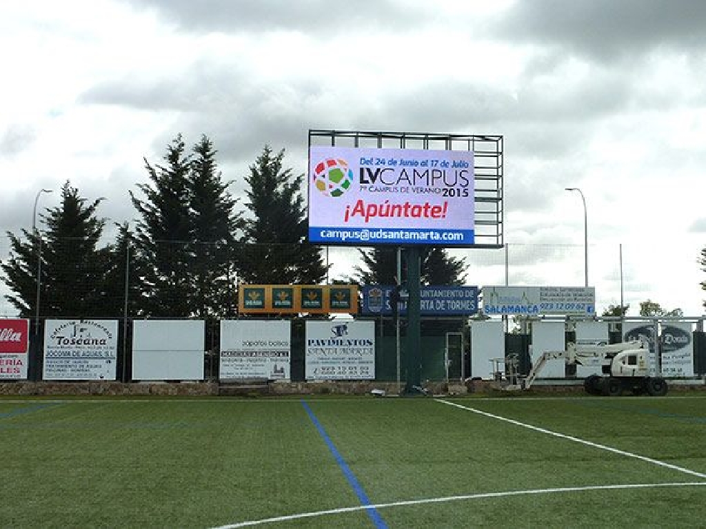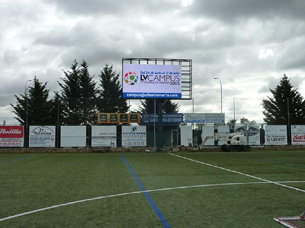 Videomarcador para campo de f煤tbol de la U.D. Santa Marta en el estadio Alfonso San Casto situado en la provincia de Salamanca. Dimensiones: 672×384 cm. Altura del monoposte: 5 m. Paso: P16mm real. Resoluci贸n de la pantalla led: 420×240 px. Incluye software multideporte para la gesti贸n del marcador y reproducci贸n de piezas publicitarias.