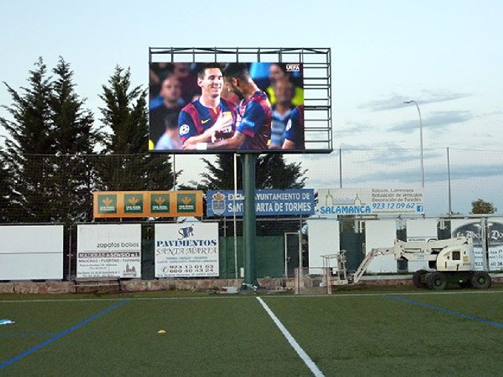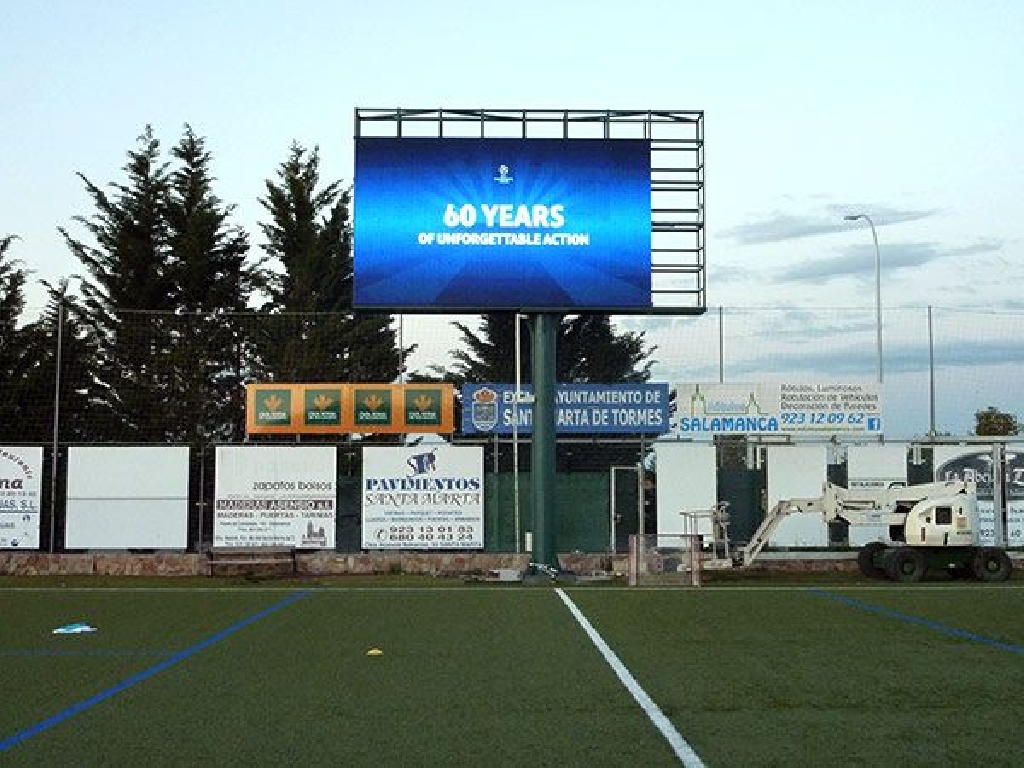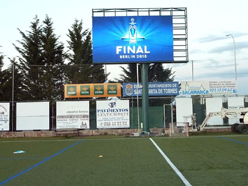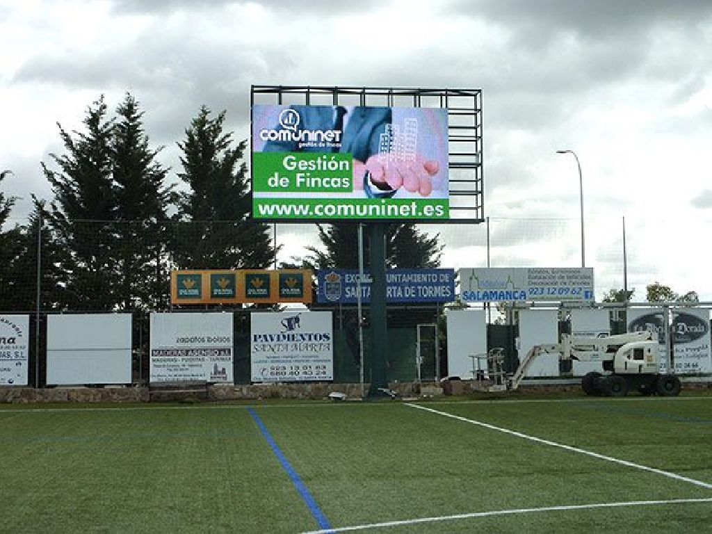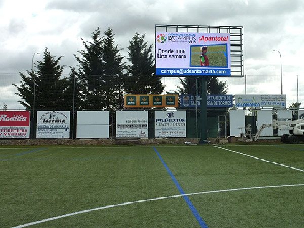 Videomarcador para campo de f煤tbol de la U.D. Santa Marta en el estadio Alfonso San Casto situado en la provincia de Salamanca. Dimensiones: 672×384 cm. Altura del monoposte: 5 m. Paso: P16mm real. Resoluci贸n de la pantalla led: 420×240 px. Incluye software multideporte para la gesti贸n del marcador y reproducci贸n de piezas publicitarias.