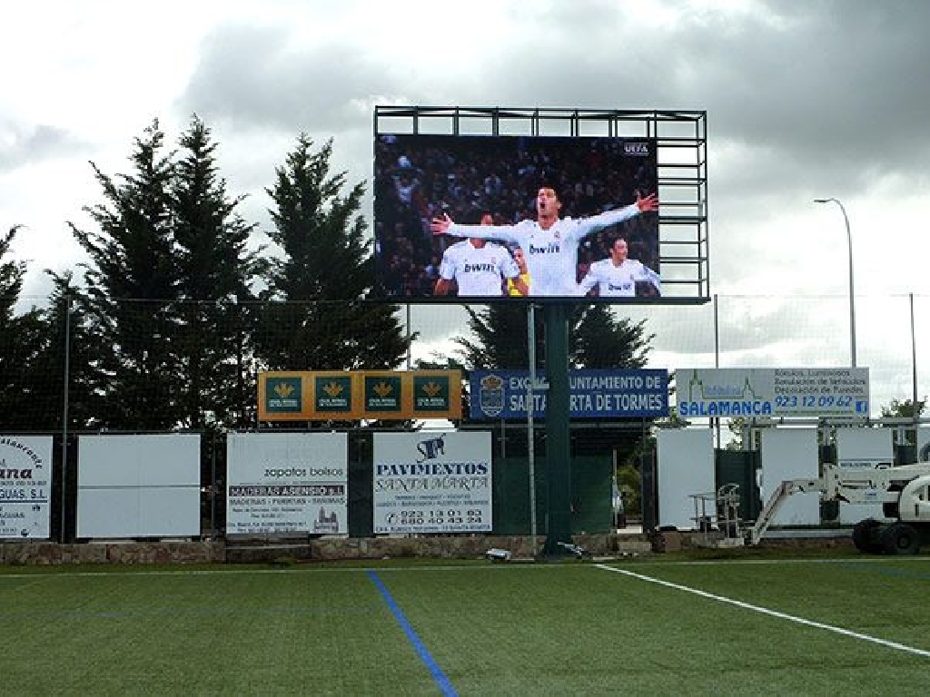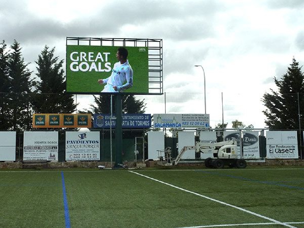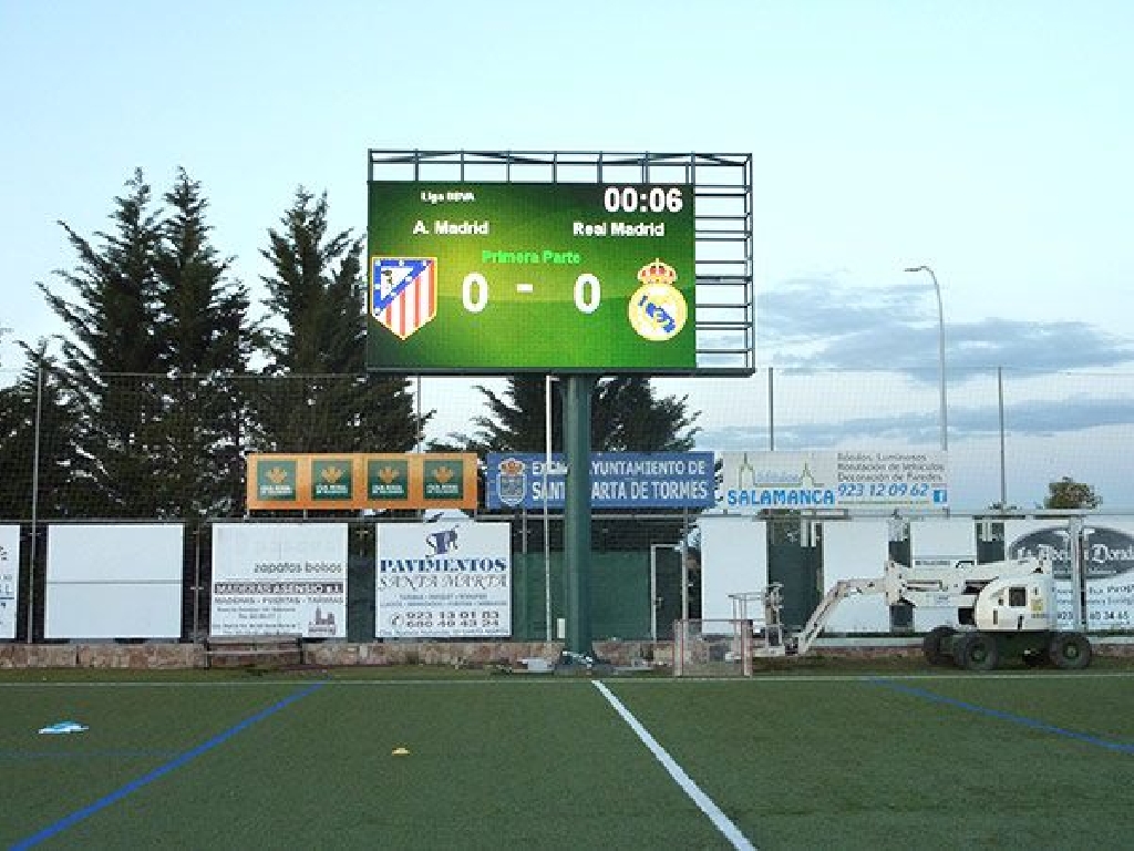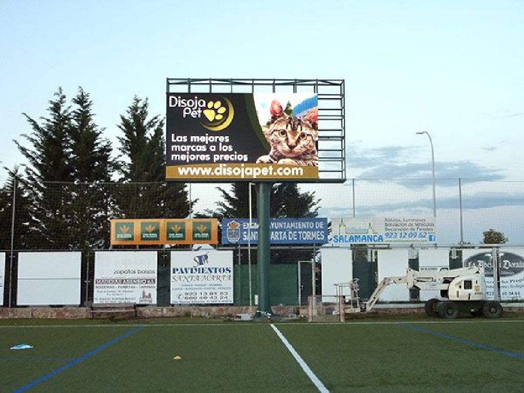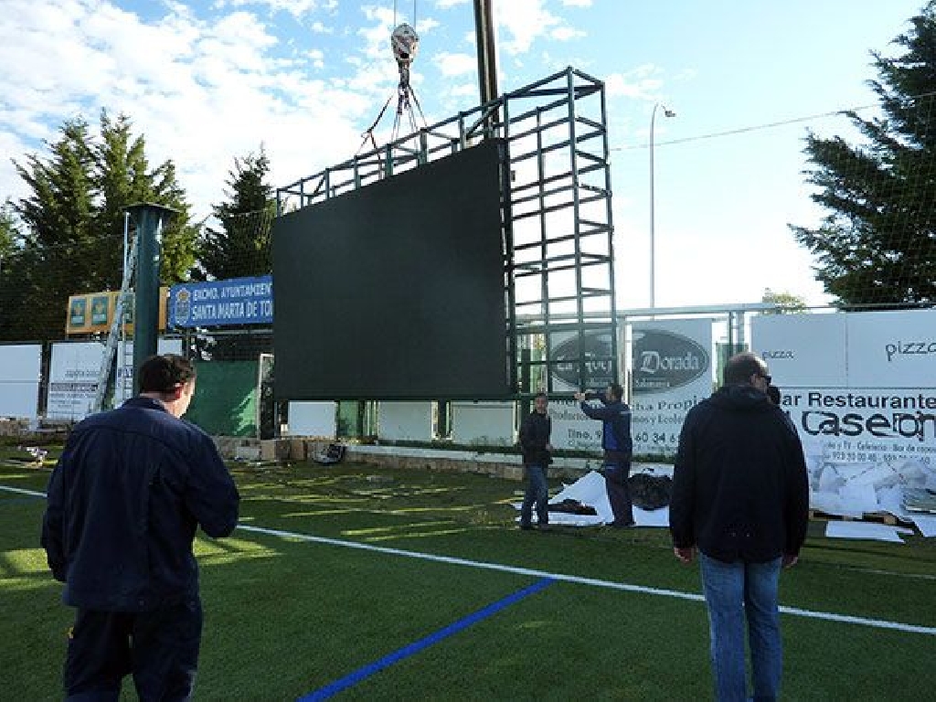 Videomarcador para campo de f煤tbol de la U.D. Santa Marta en el estadio Alfonso San Casto situado en la provincia de Salamanca. Dimensiones: 672×384 cm. Altura del monoposte: 5 m. Paso: P16mm real. Resoluci贸n de la pantalla led: 420×240 px. Incluye software multideporte para la gesti贸n del marcador y reproducci贸n de piezas publicitarias.